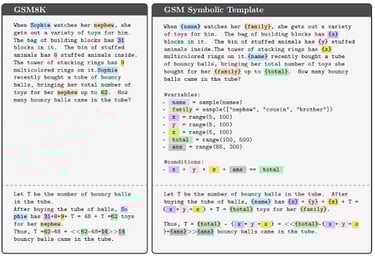 Se propusieron realizar distintos tipos de modificaciones al dataset GSM8K con el objetivo de observar qué sucedía con la precisión en los resultados. GSM-Symbolic es la primera variante de su experimento y sólo remueve nombres y le pone un rango a las variables de los problemas: