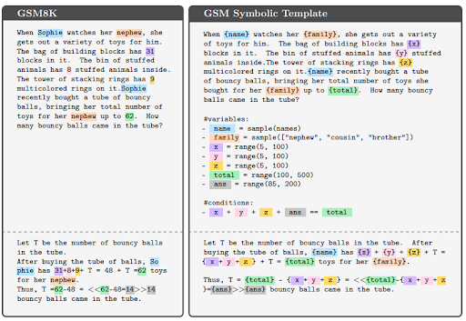 Un reciente paper de un equipo de investigación de Apple buscó responder a una pregunta parecida. Realizaron varios experimentos para entender las limitaciones del razonamiento matemático de estos modelos. Tomaron como referencia inicial un dataset (conjunto de datos) de entrenamiento de modelos de lenguaje llamado GSM8K (Grade School Math 8K).