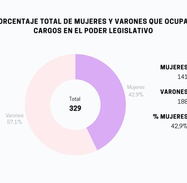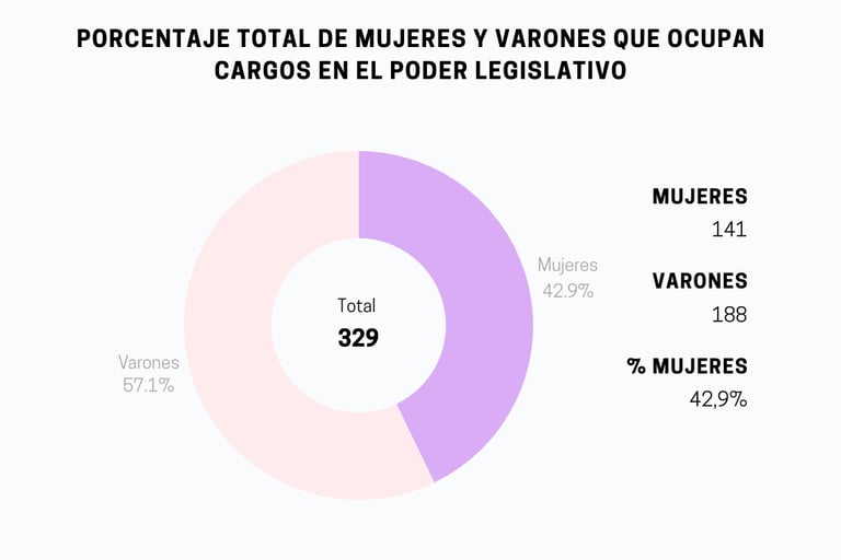 El Monitoreo Nacional actualiza constantemente las cifras de participación de las mujeres en todos los ámbitos de representación política de la Nación. Como muestra el gráfico 1, en 2024 hay un total de 329 legisladores de los cuales un 42,9% son mujeres.
