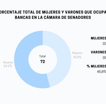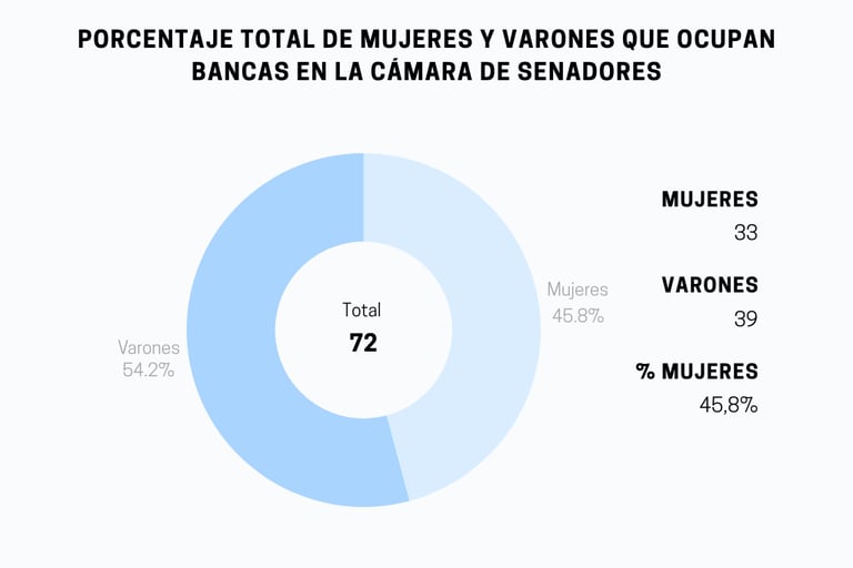 En contraste, el Gráfico 3 demuestra que en la Cámara de Senadores la distribución de género es ligeramente más equilibrada, con las mujeres representando el 45,8% de las bancas.