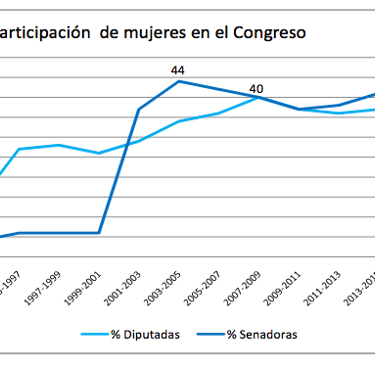 El Observatorio Político Electoral del Ministerio de Interior, Obras Públicas y Vivienda ha elaborado un gráfico respecto a cómo ha evolucionado en el tiempo el porcentaje de participación de las mujeres en ambas Cámaras desde la sanción de la Ley de Paridad de Género en 2009.